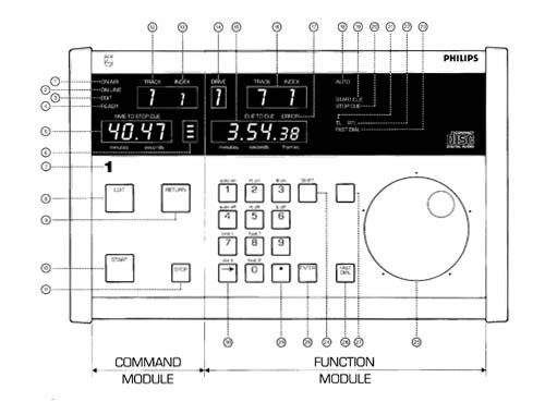 The Philips LHH2000 Professional Compact Disc Player System comprises, in its simplest form, a CD-player plus a Control Panel which incorporates a Command Module and a Function Module. The flexibility of the concept is such, that it is possible to connect up to three CD-Players (each of which must have an associated Command Module). This means that whilst one player is in operation, others can be programmed. In addition it enables continuous playing of the units, one after another using the automatic facilities which are porvided.